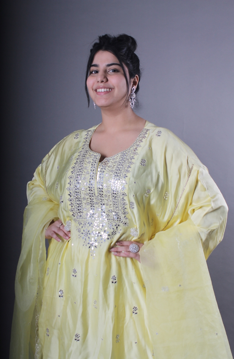 - Top Fabric : Chanderi Silk Blend ||Top Length : 2 Mtrs || Top Color : Lemon Yellow || Top Work : Thread Work Embroidery With Mirror Work