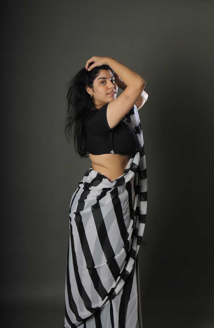 • 🌸 Saree Fabric: Georgette | Blouse Fabric: Banglori Silk|Saree Work : Zebra Printed + Scallop Mirror Work Lace Border : Blouse Work | Solid